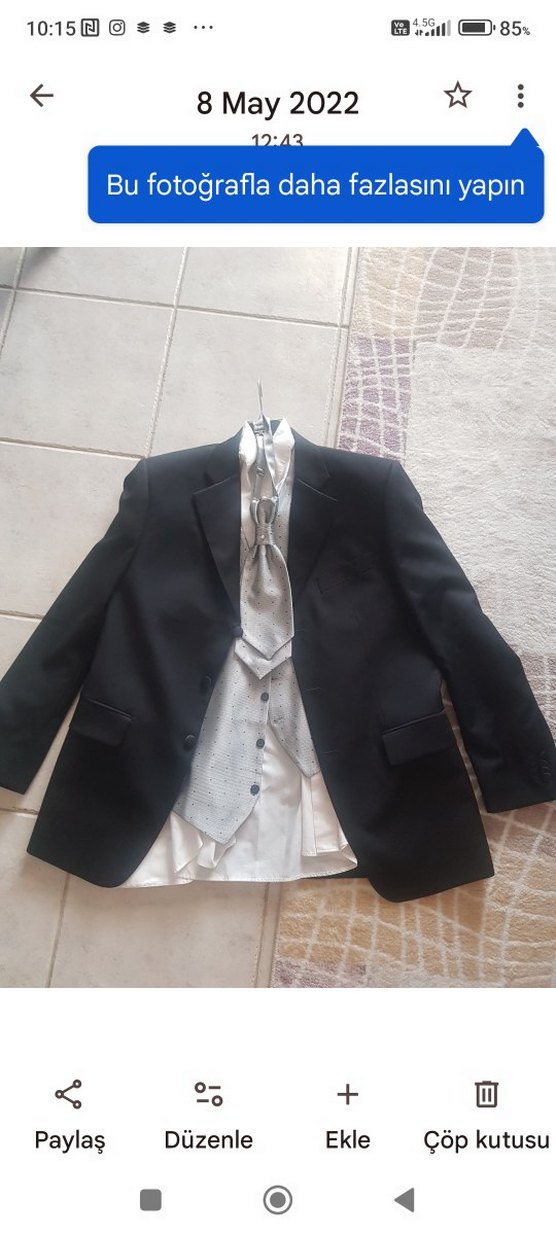 siyah renk, düğmeli ve klasik kesim erkek takım elbisesi. Uzun kollu, desen içermeyen ve ofis ortamına uygun tasarım. damatlık olarak kullanılmıştır alt pantolonu yoktur bir kez giyilmiştir gömlek kol dugmeli modeldir