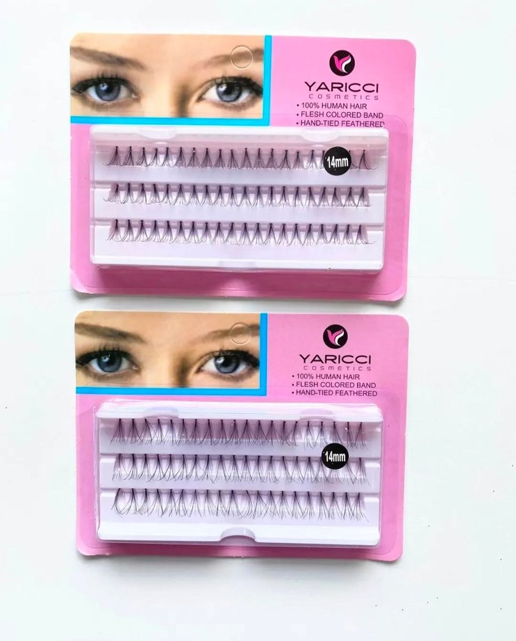 takma kirpikler 14mm uzunlukta, %100 insan saçı, ten rengi bant ve elle bağlanmış tüy efekti sunar.