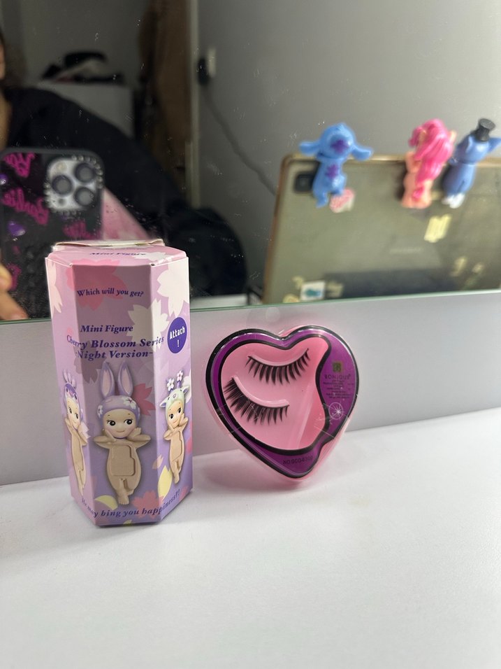 Pastel pembe renkli takma kirpikler, kalp şeklinde kutuda sunuluyor. Set içinde eğlenceli mini figür kutusu yer alıyor.
