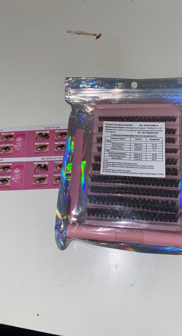 Hafif pembe renkte, çoklu kirpik demetleri ve kullanım talimatları içeren takma kirpik seti. Göz görünümünü artırmak için uygundur.