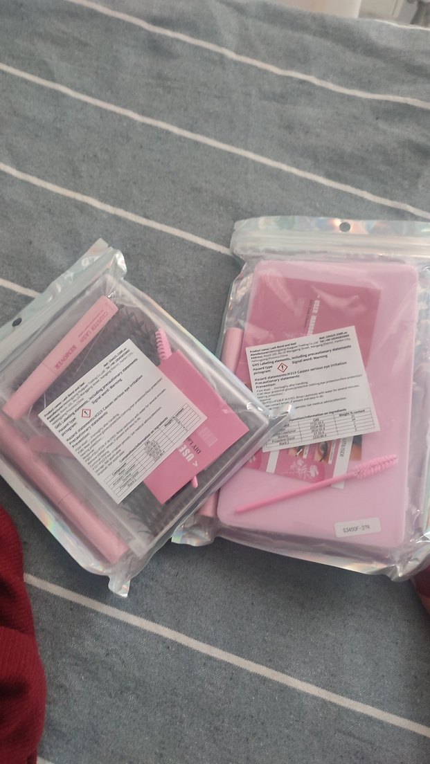 Pastel pembe renkte takma kirpik seti, uygulama araçları ile birlikte. Ambalajda güvenlik ve kullanım talimatları yer alıyor. ️