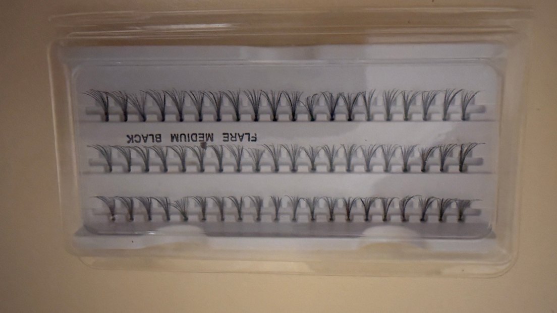 Orta boy flare tarzında bej ve gri takma kirpik seti, doğal hacim ve uzunluk sağlar. ️