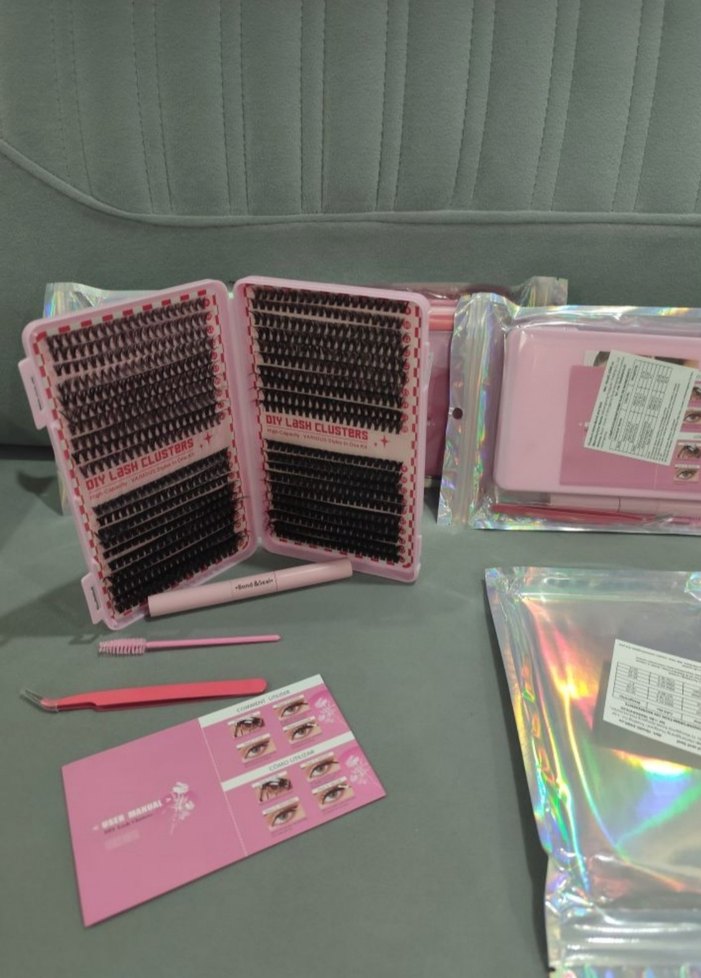 Pembe renkli hafif takma kirpik seti, kolay uygulama için kirpik kümeleri, aplikatör ve fırça içerir. Kompakt pembe kutuda sunulur. ️