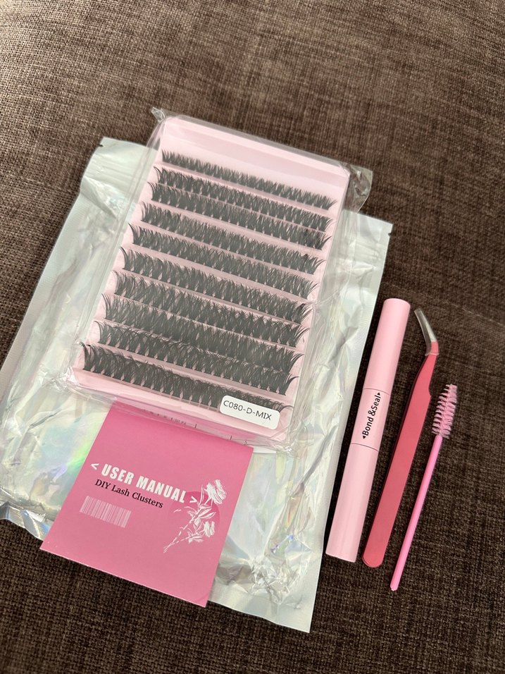 Pastel pembe takma kirpikler, kullanım kılavuzu, cımbız ve maskara fırçası içeren set. Yumuşak ve renkli kirpiklerle görünümünüzü tamamlar.
