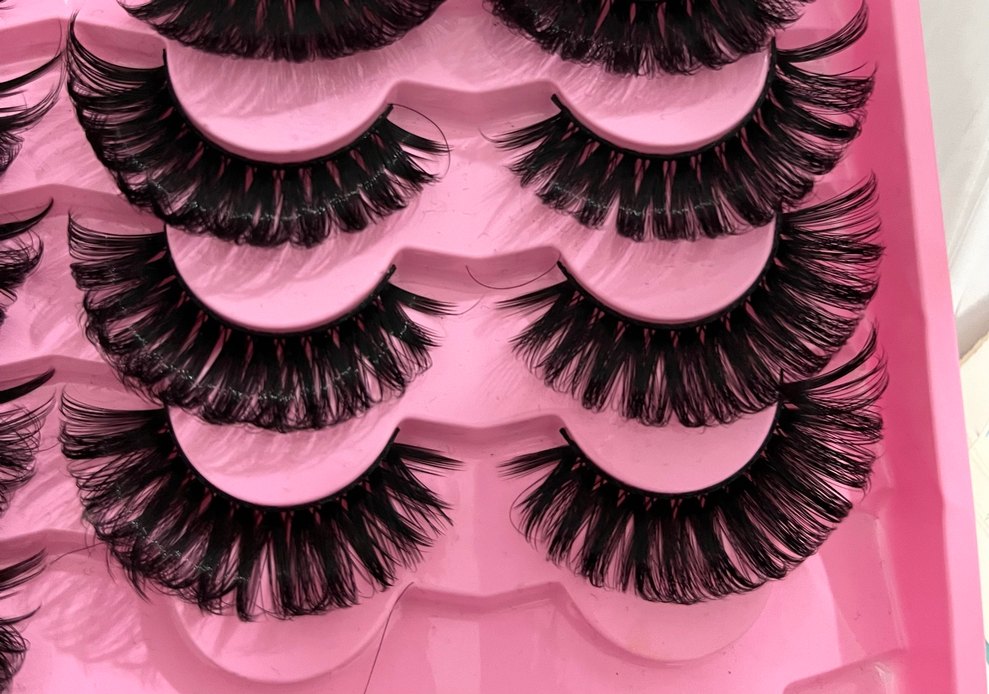 Canlı pembe tepside renkli takma kirpik seti, kalın ve hacimli kirpiklerle etkileyici görünüm sağlar.