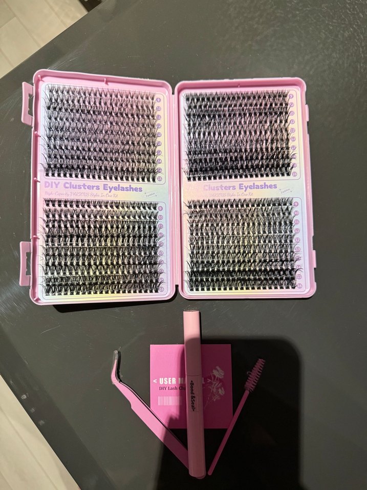 Pembe pastel renkte DIY cluster tasarımlı takma kirpik seti, cımbız ve maskara fırçası ile birlikte gelir.