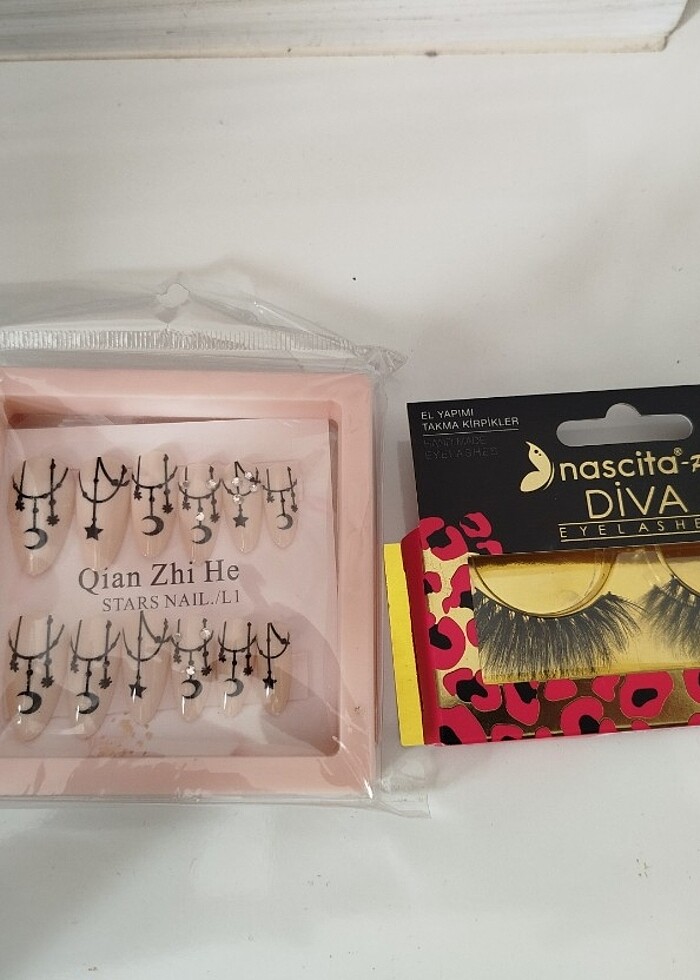 İkisi sıfır kullanılmadı takma kirpiğin yapıştırıcısı içinde,takma tırnağın fotoğrafta olduğu gibi yapışkanı var arkasında İkisi fiyatıdır