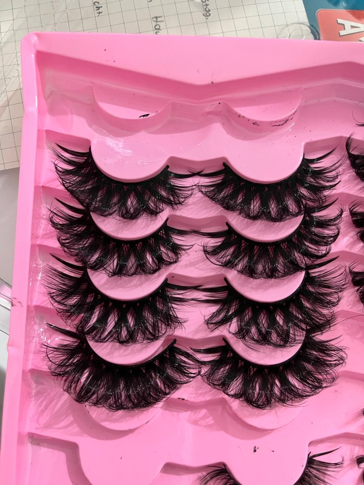 Pembe tepside yer alan koyu renkli takma kirpik seti, dolgun ve hacimli görünüm sağlar.