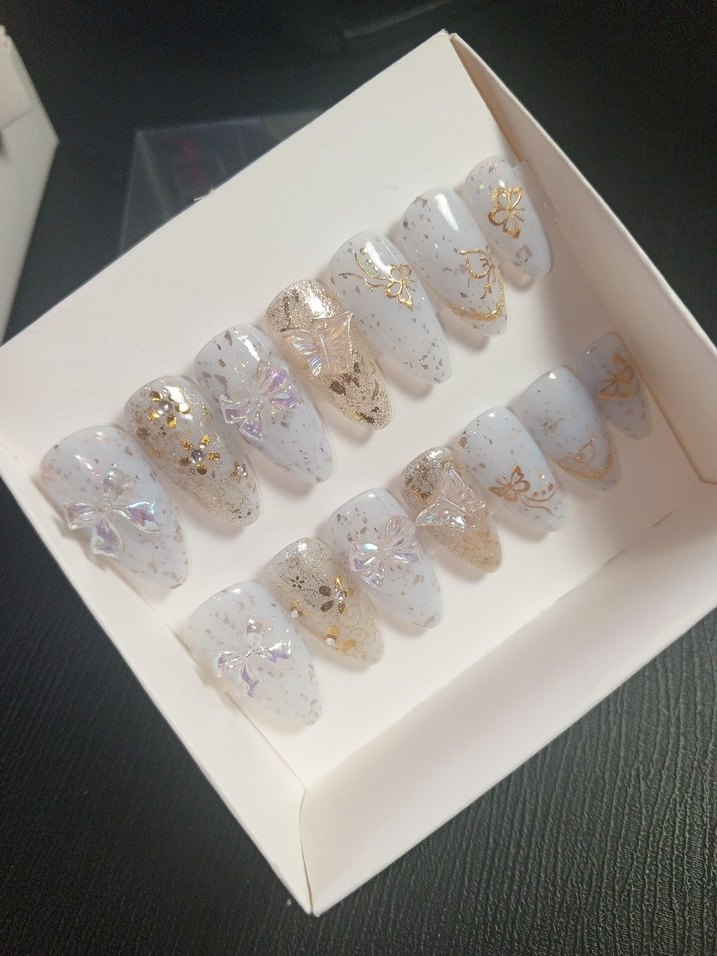 Altın ve inci renkli kelebek desenleriyle beyaz tırnak süsleri, zarif ve şık bir görünüm sağlar.