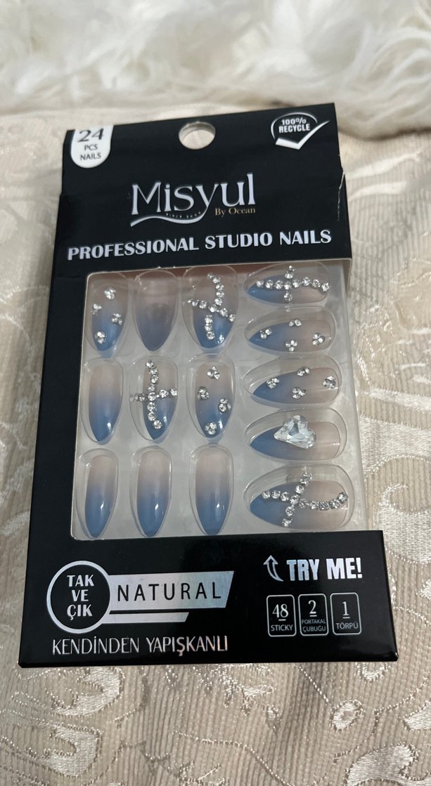 Misyul markasına ait mavi ve gri tonlarda, kendinden yapışkanlı ve taş detaylı 24 adet doğal görünümlü tırnak süsü seti. ✨