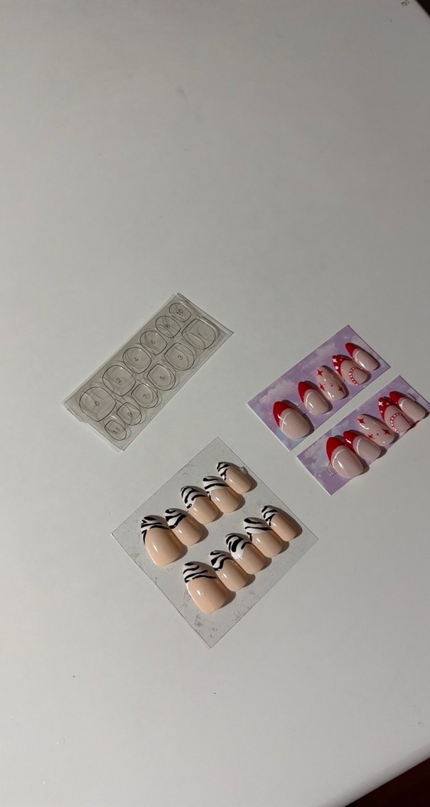 Beyaz ve canlı renklerde, kırmızı ve siyah desenli çeşitli tırnak süslemeleri seti. İkili satılır içinde yapıştırma bandı vardır. Kullanmadım