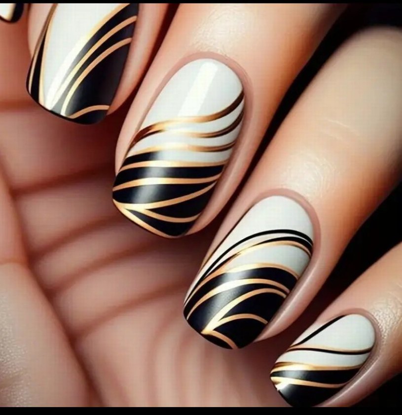 Beyaz parlak tırnak süslemeleri, şık siyah ve altın dalgalı desenlerle dikkat çekiyor.