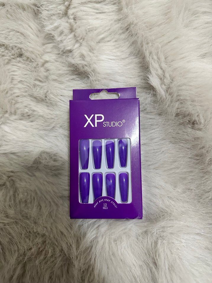 XP Studio koyu mor renkte, 12 parçadan oluşan tırnak süslemeleri ile şık ve canlı bir görünüm sağlar.