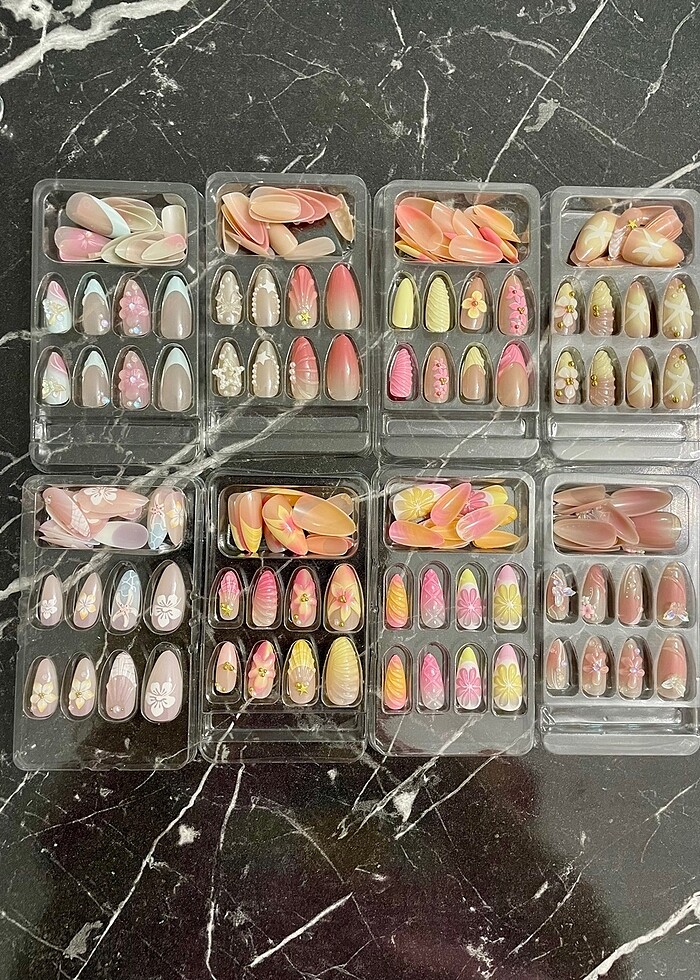 Ürünler sıfırdır. Paketli gönderilecektir. Temsili fiyattır. Beğendiğiniz modelin fiyatını sorabilirsiniz .Setin içerisinde törpü ve yapışkan mevcuttur. 12’li ve ya 24’lü şekilde satın alabilirsiniz. Ekstra sıvı tırnak yapıştırıcısı 79 tl dir. Sayfamdaki diğer tırnak modellerine de bakabilirsiniz.