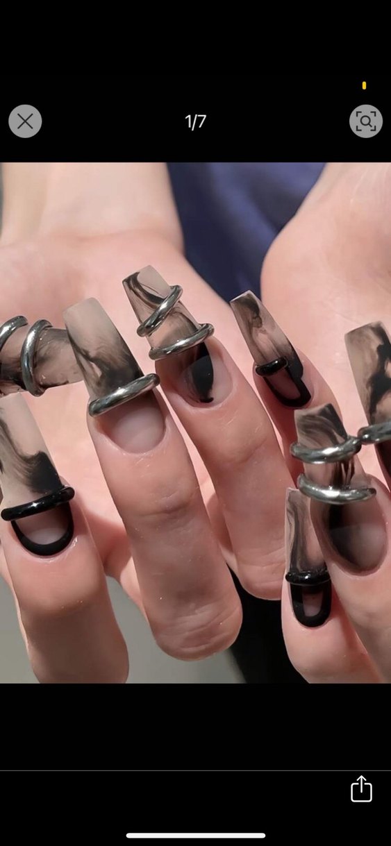 Koyu siyah renkte, yüzük şeklinde tırnak süslemeleri, tırnaklara cesur bir dokunuş katıyor.