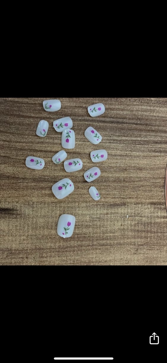 Her birinde narin pembe çiçek desenleri bulunan beyaz tırnak süsleri, tırnaklara zarif bir dokunuş katar.
