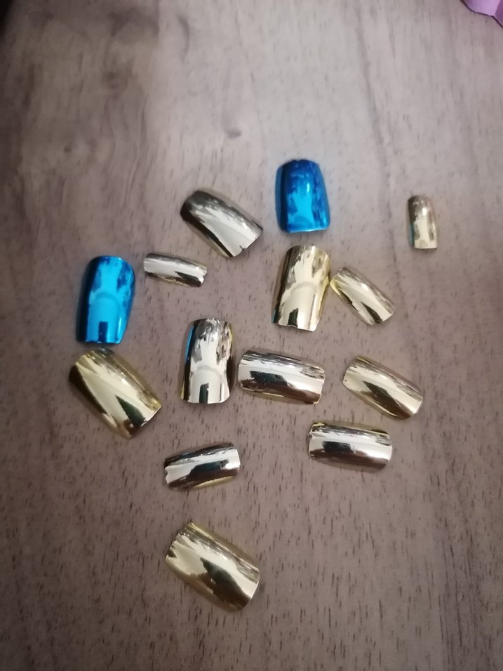 Parlak mavi ve altın renklerde, yansıtıcı yüzeye sahip takma tırnak 14 adet sıfır yapıştırıcı ile beraber gönderilecektir