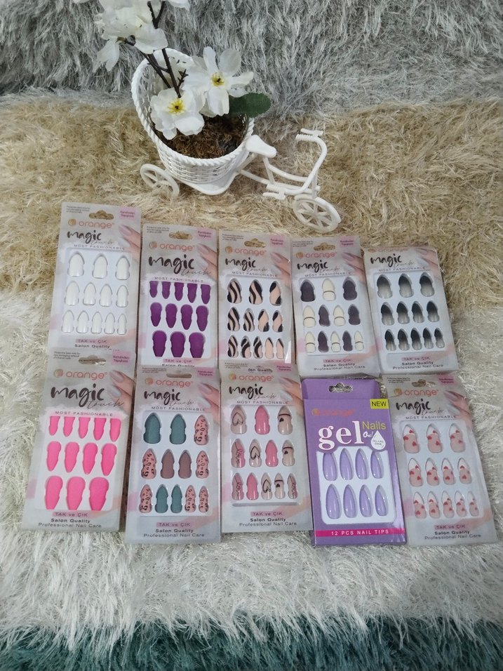 Magic, Mngic ve Gelo markalı, çeşitli renk ve desenlerde canlı tırnak süslemeleri seti.