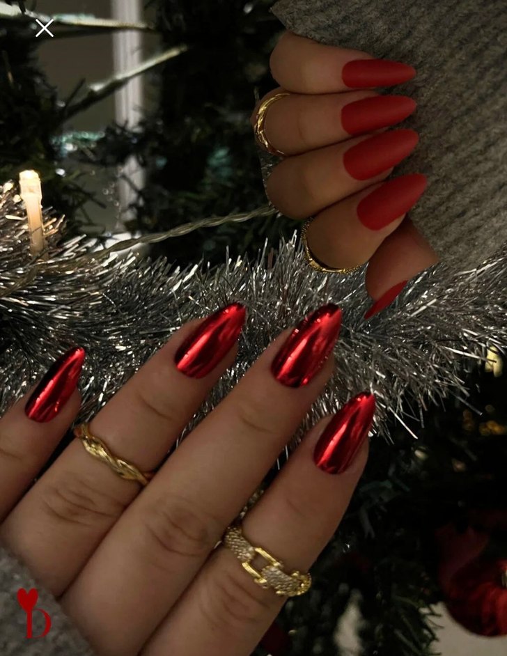 Parlak ve parlak kırmızı tırnak süslemeleri, tırnaklara cesur ve şık bir dokunuş katıyor.