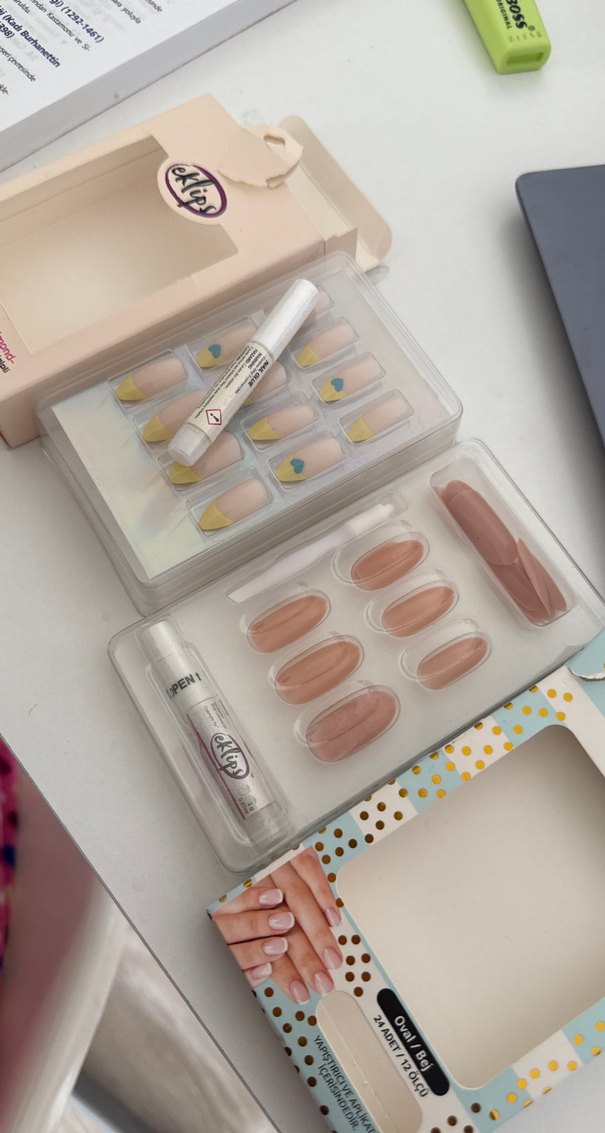 Bej ve pastel renklerde yapay tırnak seti, dekoratif tasarımlar ve yapıştırıcı ile birlikte gelir.