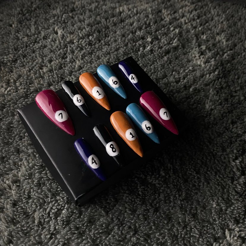 Çok renkli, koyu tonlarda parlak ve sivri uçlu tırnak süslemeleri seti.