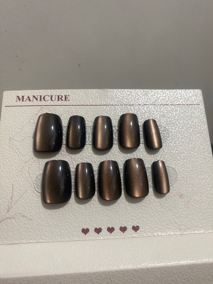 Koyu kahverengi, hafif parlak tırnak süsleri seti. Farklı boyutlarda, rahat kullanım sağlar. Xs ve S beden uyumlu 24 adet takma tırnak yapıştırıcısı ile gönderilir