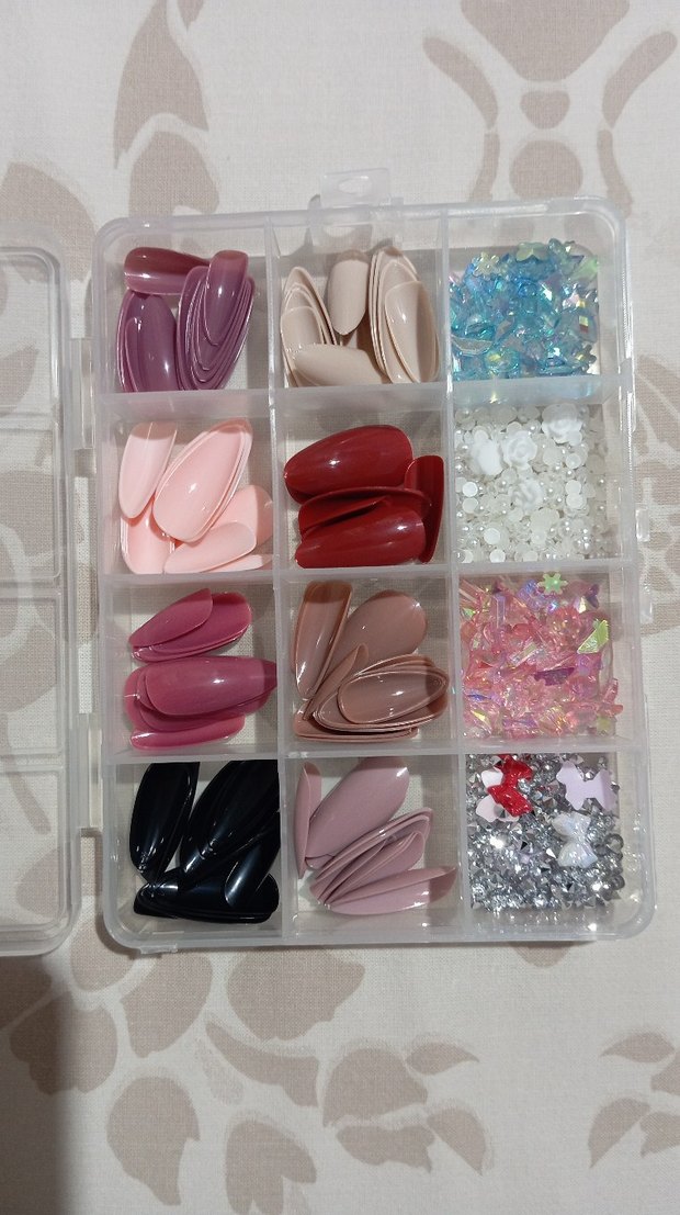 Çok renkli takma tırnaklar ve çeşitli ışıl ışıl tırnak süsleri, şeffaf kutuda düzenlenmiş olarak sunuluyor.