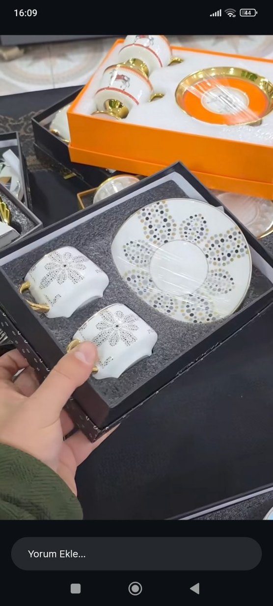 Beyaz fincan ve tabağı, koyu renkli noktalı çiçek desenleri ve altın sap detaylarıyla birlikte sunulmaktadır. ☕