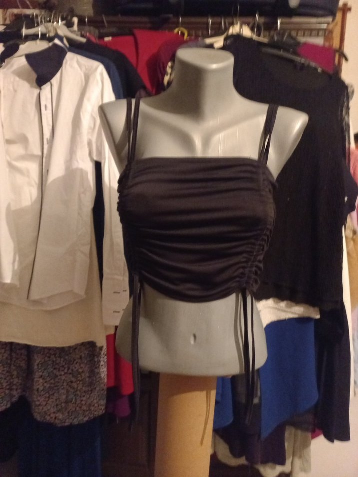 Siyah mini büstiyer, ince askılar ve drapeli tasarımıyla gotik ve şık bir görünüm sunar. Sentetik kumaştan, günlük kullanıma uygun.
