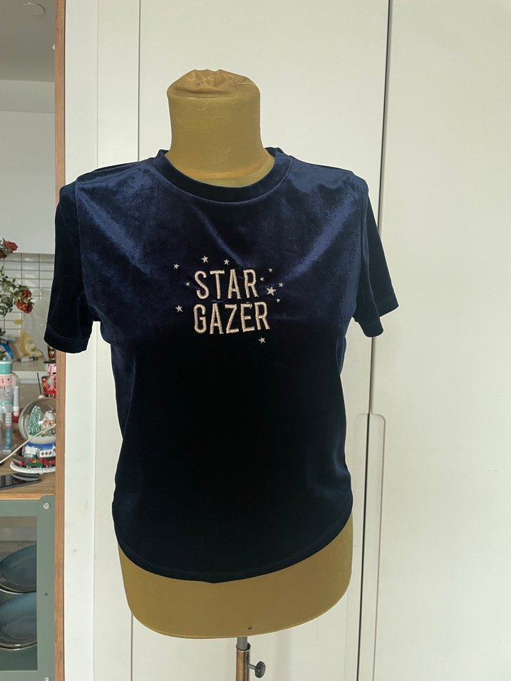 Mavi, kısa kollu kadın tişörtü, bol kesim ve yuvarlak yaka ile tasarlanmıştır. Parlak tüylü kumaş ve simli detaylarla süslenmiş, 'STAR GAZER' baskılı rahat sokak stili için uygundur.