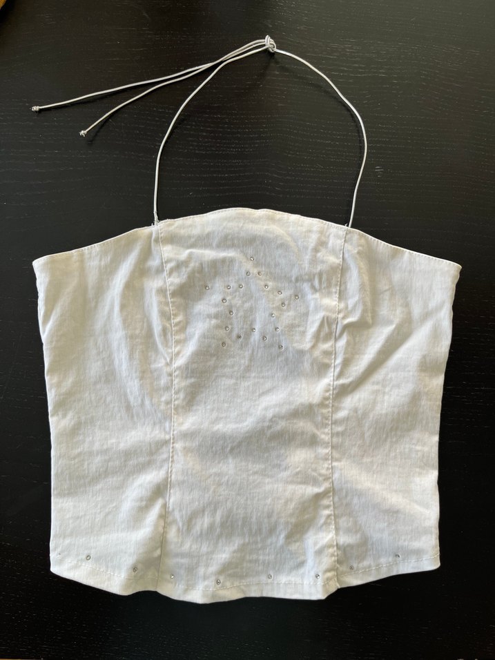 Tally Weijl marka beyaz renk ön göğüs kısmında yıldız şeklinde taş detayları olan, boyun ve sırt kısmı gümüş renk ip detaylı crop tarz şık bluz. 1 kez giyildi,yeniden farksız.Ölçüleri iki koltuk altı arası 36cm, boy 32cm