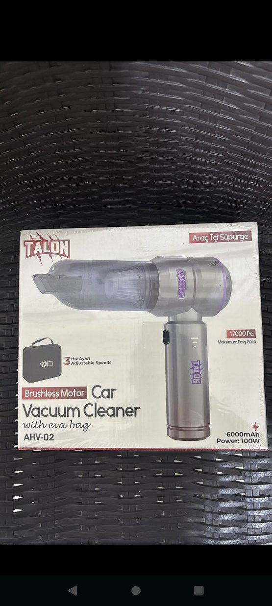 TALON AHV-02 araç içi süpürge, fırçasız motor, 17000Pa emiş gücü ve 6000mAh batarya ile. Eva torba ve 3 hız ayarı bulunur. Güç: 100W.