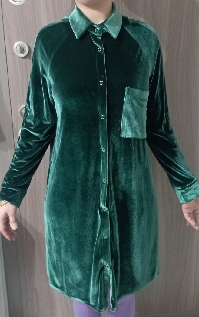 Koyu yeşil, midi boy, uzun kollu, bol kesim kadife elbise. Düğmeli ön ve göğüs cebine sahip, rahat elbise