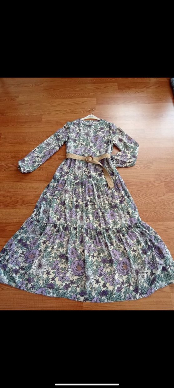 Kollar dahil tam boy astarlı, kol ucu gizli lastik detaylı, seyyar kemerli, sırttan gizli fermuarlı şifon elbise. Kemer ucunda hafif açılma var, son fotoğrafta gösterdim. Harici hiçbir sorunu yoktur. Boy:133 , Bel:45 , Göğüs:48 , Omuz:36cm
