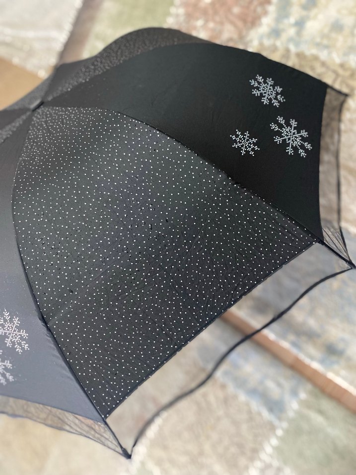 2 kez kullanıldı hiçbir deformesi yada problemi yoktur. Pul işlemeli ve kar tanesi desenli siyah kadın şemsiye, gotik ve rahat tarzı birleştirir. Moda öncülerine uygun şık ve özgün bir aksesuar. ☂️