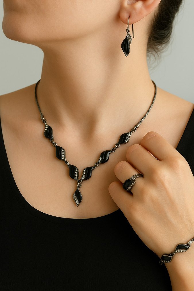 Kısa uzunlukta, zincir detaylı ve yılan desenli siyah kadın kolyesi. Günlü⚜️ Orijinal Erzurum Oltu taşı, el işçiliği ürün. ⚜️Tam takım set. Kolye, Küpe, Yüzük, Bileklik ⚜️Hiç kullanılmadı; orijinal hediye kutusunda muhafaza edildi. ⚜️Gümüşte kararma mevcut, kullanılmadığı için parlatmaya verilmedi. ⚜️Bazı beyaz taşlar yuvalarına hatalı oturtulmuş fakat dökülme ve eksik yok.⚜️ Ebatlar: Yüzük iç çap: , 3 gr; Kolye uzunluğu: 40 cm,13gr; Küpeler toplam ağırlık: 3 gr.k kullanıma uygun, çağdaş ve gotik tarzda şık bir aksesuar.