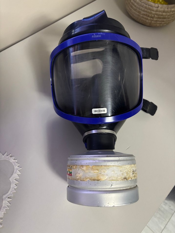 Tam yüz gaz maskesi, şeffaf vizör ve filtre kutusuyla solunum koruması sağlar. Ayarlanabilir kayışlara sahiptir. ️