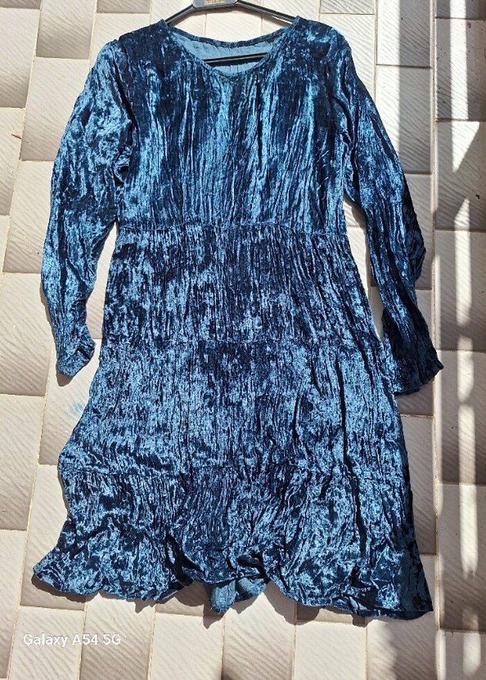 Harika, hafif parlak lacivert, cok orjinal, cok şık, diz boyu elbise. Ütü gerekmez, düğüm atarak saklanır.