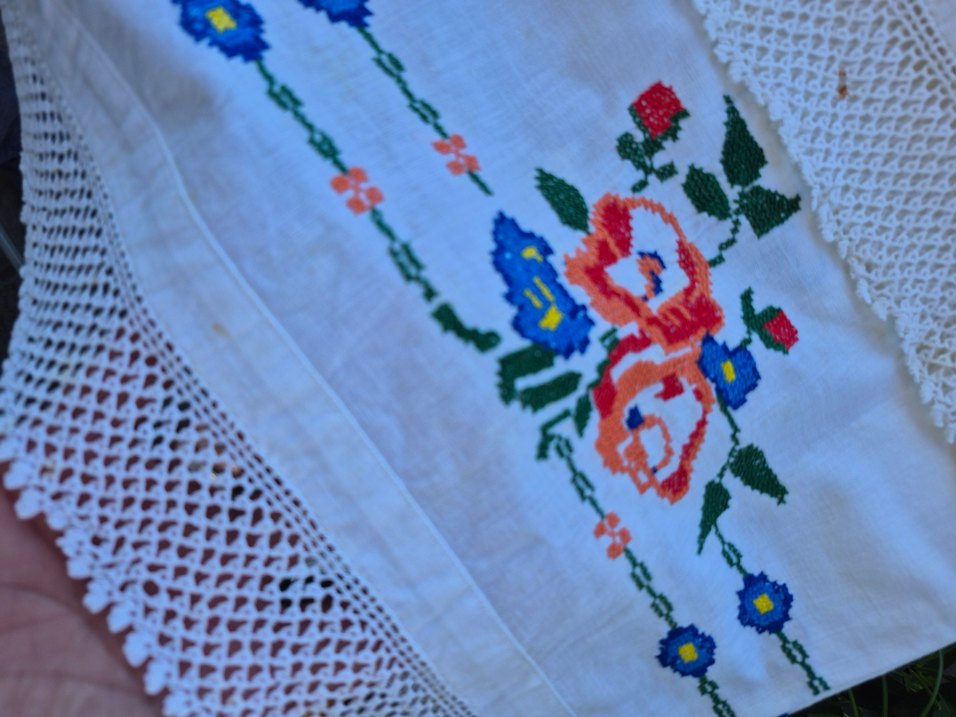 El işlemeli, bohem tarzda çiçek desenlerine sahip yumuşak kumaş. Kenarlarında ince dantel detayları bulunur. sandıktan çeyizlik