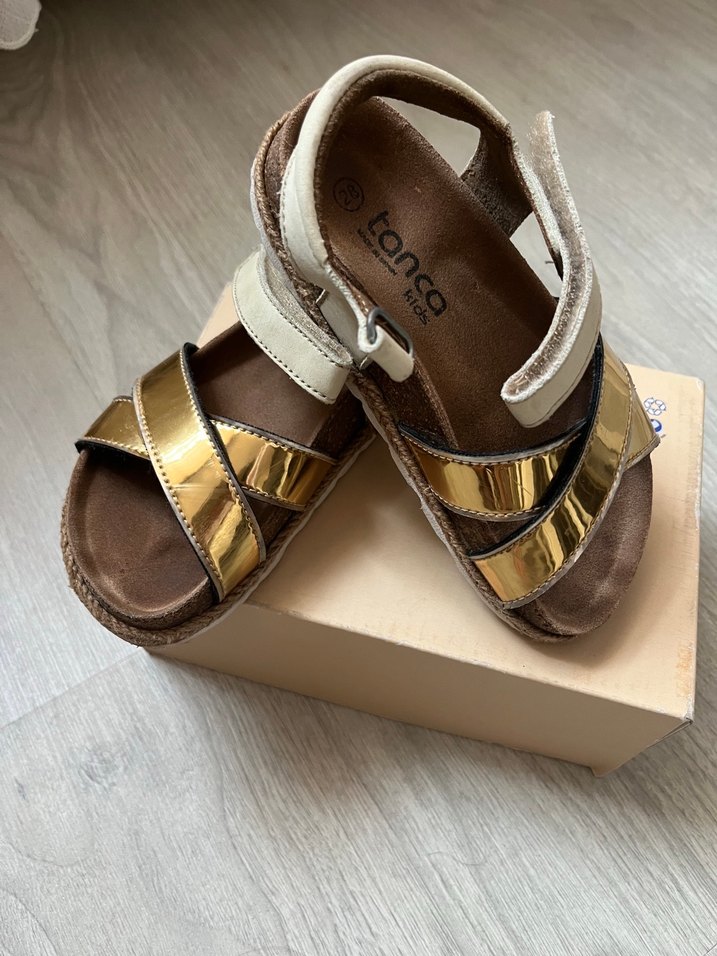 Kız çocuklar için tokalı, parlak altın renkli sandalet. Yumuşak kauçuk malzeme ile bohem tarzda orijinalTanca marka.
