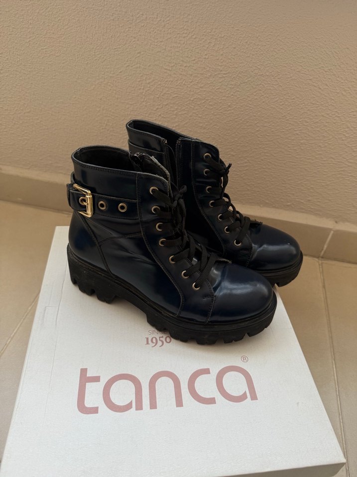 Tanca markalı lacivert deri botlar, platform topuk ve tokalı tasarımlı