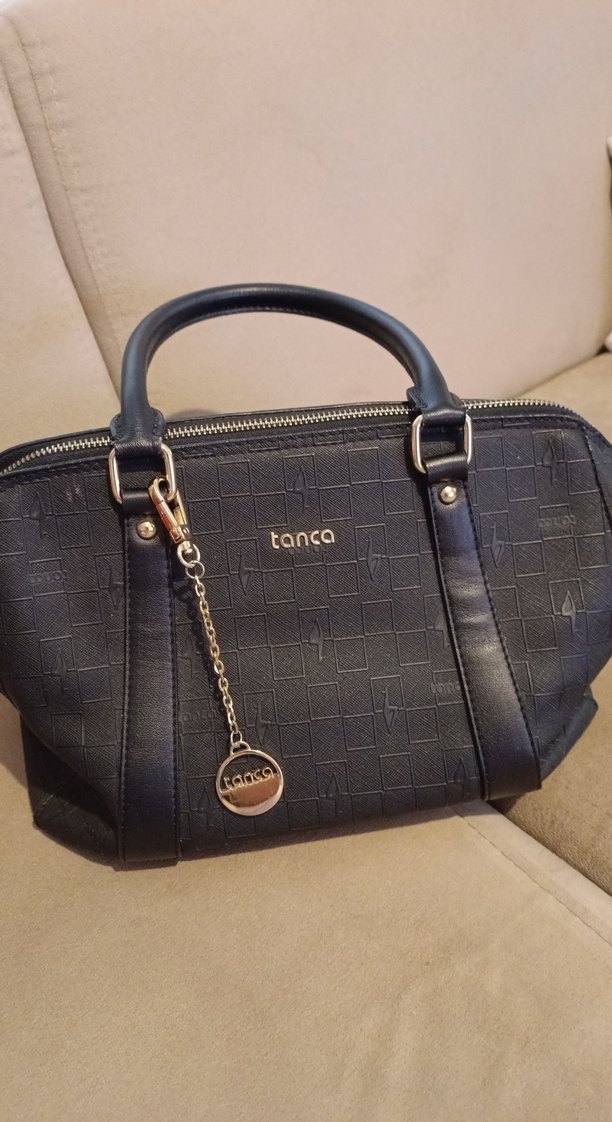 Siyah deri, tokalı saplı, desenli ve mat yüzeyli Tanca marka kadın çantası. Modern klasik tarzda, günlük kullanıma uygun.