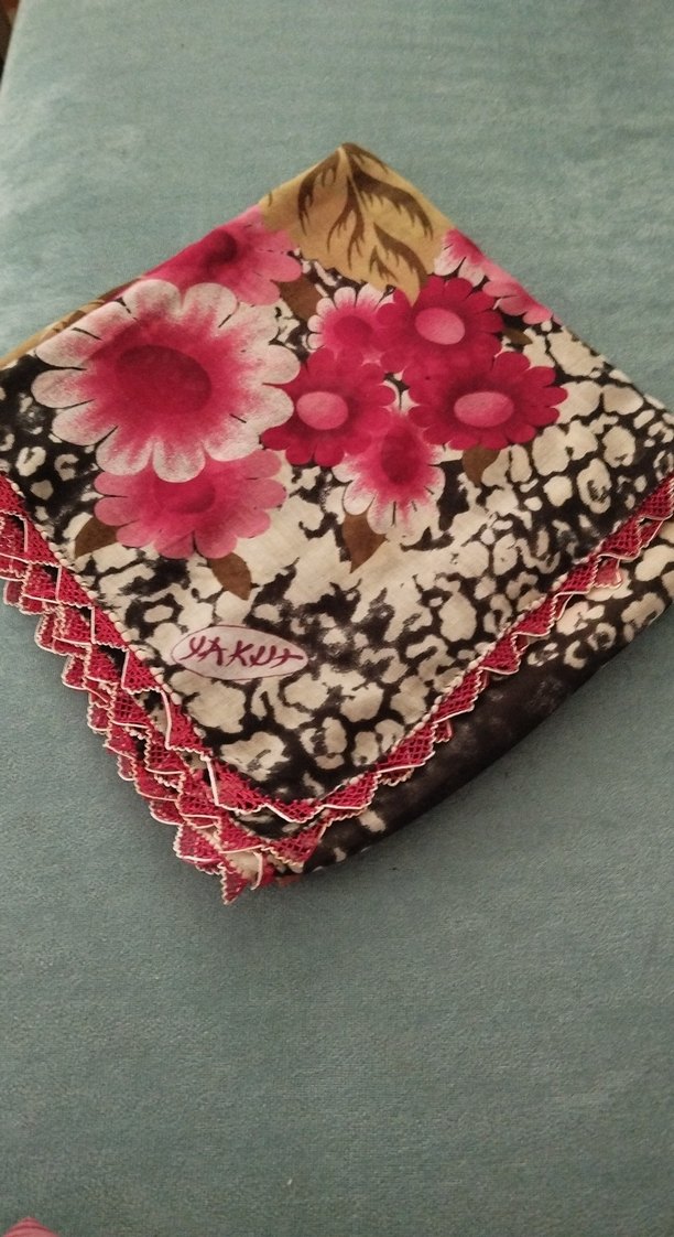 Dantel kenarlı, koyu pembe renkte, vintage çiçek desenli tekstil kadın fular. "YAKU" etiketi bulunur. Bohem tarzına uygundur.