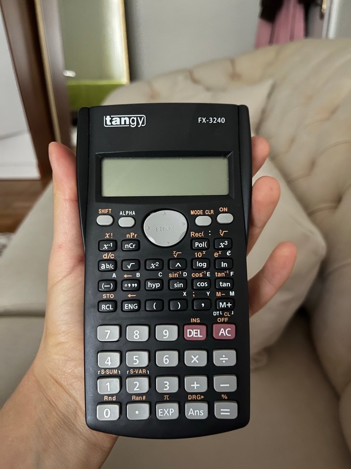 Tangy FX-3240 hesap makinesi, koyu gri renkte olup DEL, AC ve EXP gibi fonksiyon tuşlarına sahiptir. Çoklu matematiksel işlemler için uygundur. İçinde pil yoktur ama hiç kullanılmamıştır ve sağlamdır.