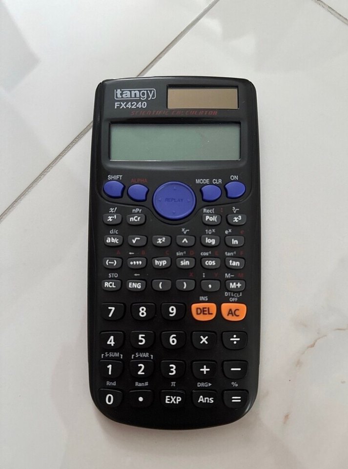 Tangy FX4240 bilimsel hesap makinesi, siyah renkte ve çok fonksiyonlu tuşlara sahip. Çift ekranlı, Ans ve EXP tuşları bulunur.