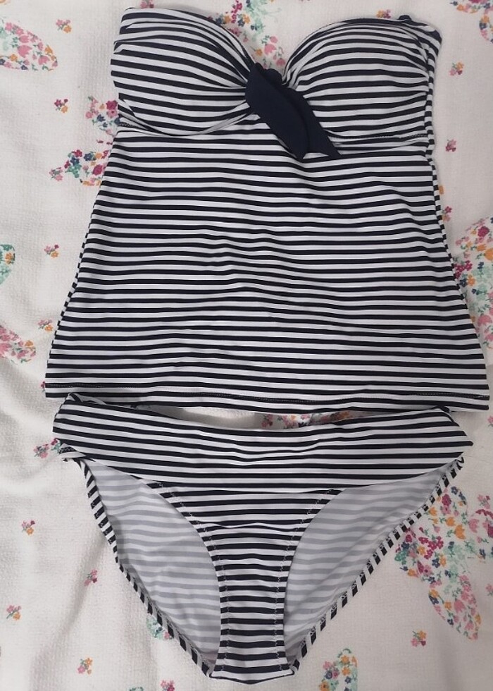 36 beden yeni sayılacak kadar az kullanıldı. Lacivert çıkartılabilie askıları mevcut. Göğüs pedli. Lacivert beyaz çizgili, LCW marka tankini mayo