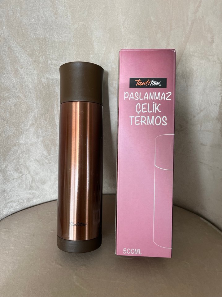 500ml kapasiteli paslanmaz çelik termos, koyu bej renkte, güvenli kapaklıdır ve içecekleri uzun süre sıcak veya soğuk tutar. sadece kapağındaki düğmesi bozuktur onun dışında sayılı kullanıldı