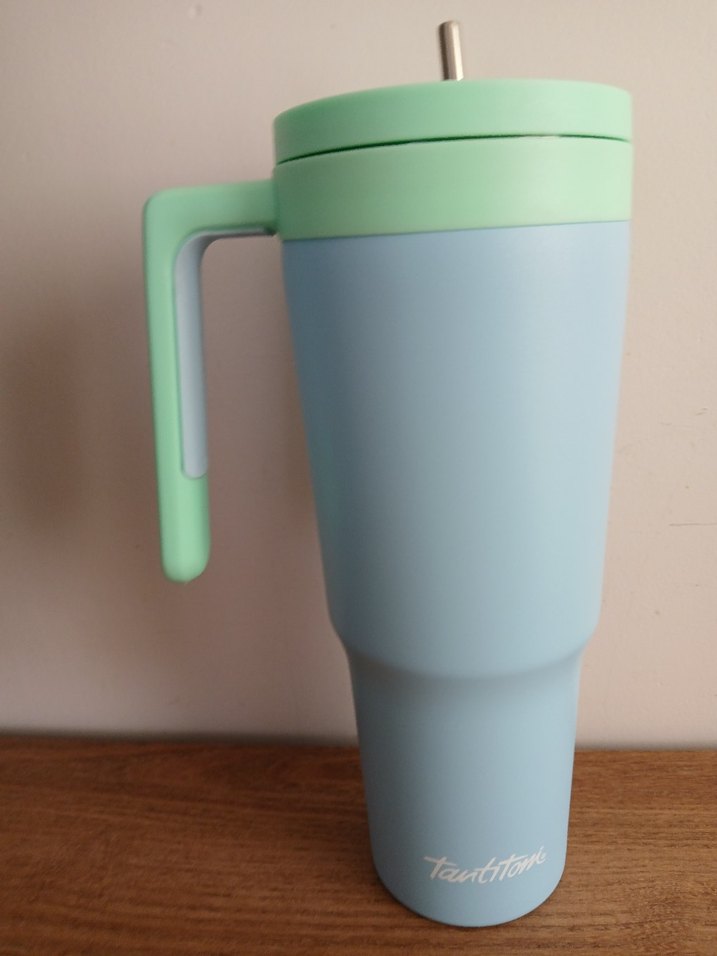 Saplı ve kapaklı pastel turkuaz termos bardak, metal pipet içerir. Sıcak ya da soğuk içecekler için uygundur. ☕