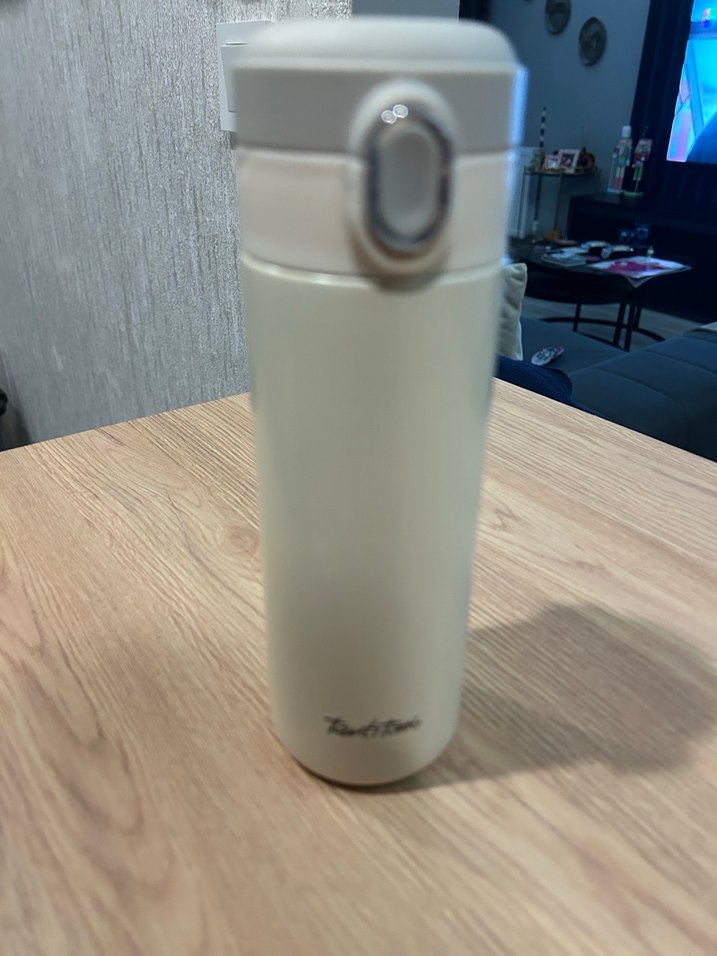 Beyaz ve gri renklerde çocuk termosu, kolay içim için kilitli açılır kapağa ve taşınabilir kompakt tasarıma sahiptir.