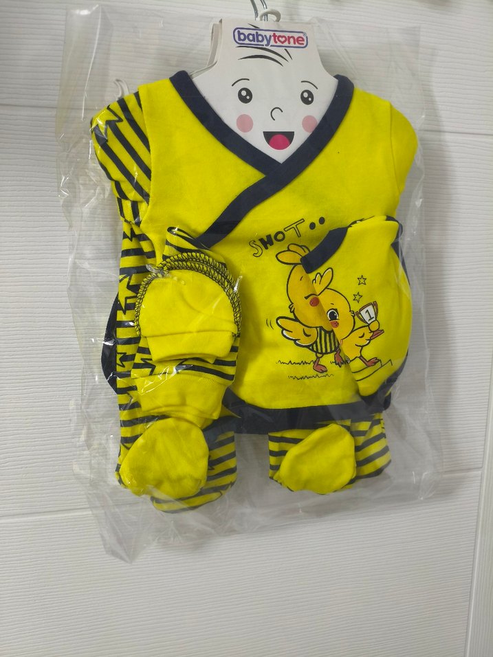 Renkli, uzun kollu ve düğmeli sarı bebek takımı, yumuşak ve sıcak kumaştan yapılmıştır. Baskılı desen ve eldivenler içerir.